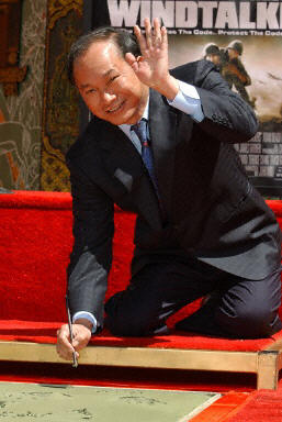 5月21日,中國香港著名導演吳宇森在美國影城好萊塢的“中國戲院”前的水泥地板上印上了自己的手印和足印。法新供中新