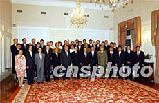 六月三十日,國家主席江澤民在香港禮賓府會見七月一日上任的第二屆香港特區政府“高官”及知名人士,圖為江澤民主席與他們合影。潘索菲 攝