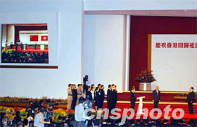 董建華宣誓就任香港特區(qū)第二屆政府行政長(zhǎng)官。7月1日上午,董建華宣誓就任香港特區(qū)第二屆政府行政長(zhǎng)官,中國(guó)國(guó)家主席江澤民監(jiān)誓。中新社傳真任晨鳴 攝