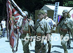 十五日是日本戰(zhàn)敗五十七周年紀(jì)念日,在供奉有二戰(zhàn)戰(zhàn)犯的的靖國(guó)神社前,一群穿著原“鬼子兵”軍服的人趾高氣揚(yáng)地來(lái)回游走。陶光雄 攝