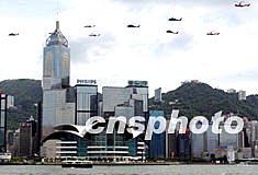 香港政府飛行服務隊的九架直升機8月15日在晴朗的香港維多利亞港灣上空列隊緩緩飛行,向即將退役的黑鷹直升機致敬。該飛行隊將由新型超級美洲豹直升機替換服務了十二年的黑鷹直升機。任晨鳴 攝