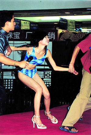 圖文:女模特脫衣推銷 男朋友憤而攪場(chǎng) 2002年08月19日 10:30 ![]() ■長(zhǎng)衫就是“防腐層”■短裙代表“塑料”■脫得只剩內(nèi)衣 ![]() ■男友硬拉模特離場(chǎng) 攝影/趙訓(xùn)成 中新網(wǎng)北京8月19日消息:讀者趙先生昨天給北京青年報(bào)打來(lái)熱線說(shuō),他前天在一個(gè)購(gòu)物廣場(chǎng)看到一個(gè)管道廠家為了讓人們更了解“管道”的內(nèi)部結(jié)構(gòu),竟然讓兩位假扮“管道”的小姐一層一層脫道具服,直到小姐的男友出面干涉才罷休。 趙先生講述了事件的整個(gè)過(guò)程:“當(dāng)時(shí),我在商場(chǎng)購(gòu)物,看見(jiàn)一家管道企業(yè)正在推介產(chǎn)品。兩位扮演‘管道’的女模特當(dāng)著眾人的面脫起衣服,這讓不少觀眾大吃一驚,還有一些母親趕緊捂上孩子的眼睛。這兩位女模特直到露出了穿在里面的內(nèi)衣才停止。忽然,一位女模特的男友出現(xiàn),硬拉女模特要離開(kāi),但廠家人員就是不讓,雙方開(kāi)始爭(zhēng)執(zhí),場(chǎng)面頓時(shí)變得異常混亂。” 有關(guān)廣告專家分析說(shuō),讓消費(fèi)者反感的廣告形式有可能抬高了企業(yè)的“知名度”,但是卻降低了產(chǎn)品的“美譽(yù)度”,反而會(huì)給產(chǎn)品銷售帶來(lái)負(fù)面效果。畢竟,消費(fèi)者是否選擇這種產(chǎn)品,最終還是決定于產(chǎn)品質(zhì)量和售后服務(wù),這樣的“秀”還是少做為好。(王旭)