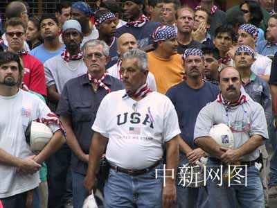 美國東部時間九月十一日上午八點四十六分,總是施工不斷的紐約市停頓下來。建筑工人們聚集在街道邊,把印有美國國旗圖案的手帕裹在頭上、纏在頸上,肅立默哀。去年的這一時刻,被恐怖分子劫持的第一架飛機撞向了世貿中心大樓。中新社記者 陳建 攝