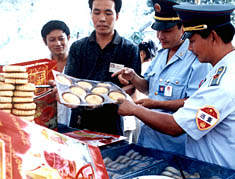 中秋節(jié)前夕,山東棗莊的工商人員在集市上檢查月餅質(zhì)量,以保證消費(fèi)者在中秋節(jié)吃到質(zhì)量信得過(guò)的月餅。 作者:高貴軍