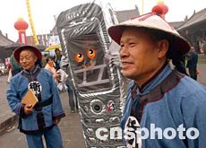 九月山西平遙國(guó)際攝影大展上,外國(guó)手機(jī)廣告卡通與仿古衙役相聚助興。作者:賈國(guó)榮
