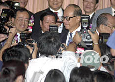 香港潮屬社團9月23日晚舉行慶祝中華人民共和國國慶酒會,長實集團主席李嘉誠出席時從頭到尾都成為傳媒追逐的對象。任晨鳴 攝