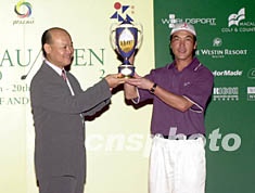 “2002澳門高爾夫球公開(kāi)賽”二十日結(jié)束比賽,中國(guó)選手張連偉成功衛(wèi)冕,獲得該賽事冠軍。圖為澳門體育發(fā)展局局長(zhǎng)肖威利向張連偉頒發(fā)獎(jiǎng)杯李剛 攝