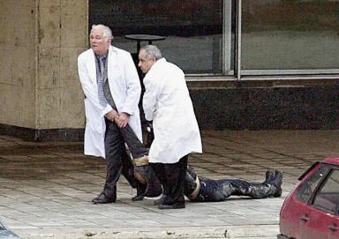 10月24日,在莫斯科軸承廠文化宮劫持數百名人質的車臣武裝分子槍殺一名女性人質。圖為兩名醫務人員移走被車臣武裝分子槍殺的女子尸體。