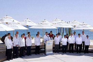 記者看到,上午八時半左右,墨西哥總統(tǒng)?怂辜丛跁䦂鐾庖灰挥蚺c會者。九時許,按APEC傳統(tǒng),與會領(lǐng)導人和代表著東道主提供的特色民族服裝拍攝“全家!薄Ec上屆上海峰會的中式唐裝相比,今天的“瓜亞貝拉”同樣極有“個性”,它是墨西哥東南部流行的一種傳統(tǒng)服裝,為精一色的白色,有四個胸袋。合照背景為太平洋碧藍的大海,藍白相襯,在美麗的洛斯卡沃斯留下了一道亮麗的風景線。