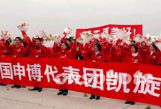 五日上午,中國申博代表團專機抵達上海浦東機場,數百名上海市民、國際交流活動志愿者和大學生等前往浦東機場歡迎中國申博代表團凱旋。作者:潘亞萍