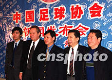 中國足球協會二十二日在北京正式宣布荷蘭人阿里·哈恩成為中國國家足球隊主教練。圖為金志揚、朱元和、南勇、阿里·哈恩(從右至左)等人在新聞發布會上。作者:武仲林