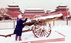 北京連續六天降雪創下百年紀錄。二十四日,京城終于雪過天晴,一位保潔工人正在故宮午門前清掃神威大炮上的積雪。作者:張煒