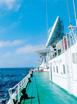 二十時(shí)四十分,當(dāng)“神舟”四號(hào)飛船飛行至南大西洋上空時(shí),正在此處待命的“遠(yuǎn)望”三號(hào)測(cè)量船準(zhǔn)確捕獲目標(biāo),北京航天指揮控制中心根據(jù)軌道控制計(jì)算結(jié)果及時(shí)發(fā)出遙控指令。