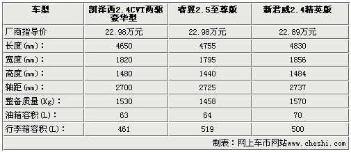 影音系統方面,三款車都為使用者提供了多揚聲器的配置,除了AUX/USB接口外,凱澤西還配備了單碟CD,而睿翼則配備了更為便利的6碟CD系統,新君威為單碟DVD。通過以上參數配置方面的比較,對于三款22.98萬左右的中級車,配置方面基本打成平手,僅在一些細節方面有所出入,不過動力方面凱澤西確是實實在在的戰勝了睿翼和新君威,幾乎將2.4L引擎的動力發揮到了極致。