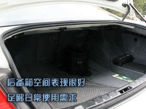 測試者座椅調(diào)整合適以后,正常坐姿時(shí)頭部有一個(gè)拳位余量,腿部活動(dòng)自由,沒有特別拘束的感覺;后排空間表現(xiàn)良可,測試者正常坐姿下,腿部空間表現(xiàn)很好,有兩個(gè)拳位余量,頭部表現(xiàn)一般,有兩指空間,測試者稍有壓迫感。(測試者身高178CM)