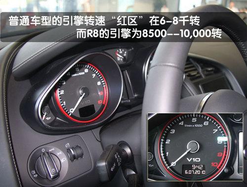 通過駕駛室內的轉速表可以看出,這臺發動機的轉速范圍可以達到最高9000轉,而“紅色區域”從8000轉才剛剛開始。也就是說有它別于一般的車輛,為了得到最佳的功率和扭矩輸出,讓R8的發動機保持在5-8千轉進行工作是相對合理的。這時,每一個聽到R8呼嘯的人也許都會說:“喔,我想那輛車一定非常棒!”奧迪R8提供了三幅真皮包裹的運動型方向盤,在10點和2點位置都有凸起從而方便駕駛員的抓握。多功能方向盤后方的換檔撥片可以在手動模式下實現類似F1賽車式的換檔方式。