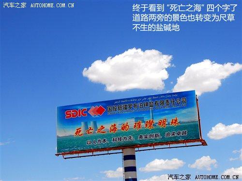 期待了數天的“死亡之海”、羅布泊等字眼終于映入眼瞼,一個醒目的廣告牌就樹立在路旁。此時我們離羅布泊的距離也只有100多公里了,兩旁的景物像女人一樣,說變就變了,沙漠已經被一望無際的鹽堿地所取代。