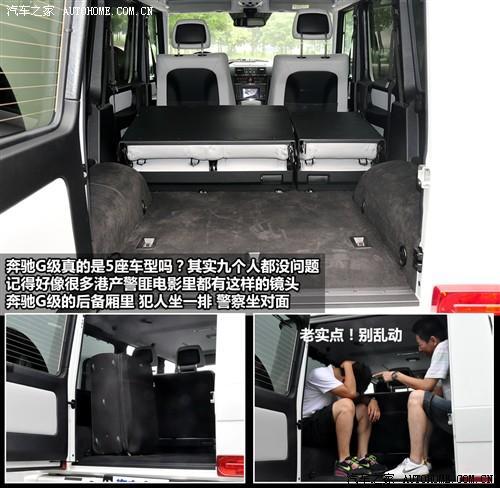 除了能載物外,奔馳G級后備廂兩邊的凸起正好可以坐下每邊兩個人,不過這樣上路可是法律所不允許的,所以像上圖那樣警察押送犯人的情景還是僅限于靜態比較好。而當掀起整個后排座椅后,寬大的后備廂足以運載冰箱或洗衣機這類的大件物品,出色的垂直空間也使物品的高度不再受太多的限制。