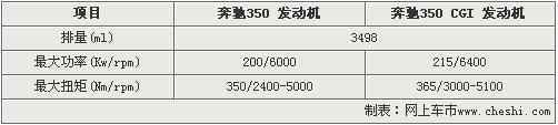 奔馳的CGI壓電直噴引擎不僅已經應用在國產奔馳新C和新E等1.8T渦輪增壓車型上,而且3.5 CGI發動機也在海外奔馳E350 CGI和CLS350 CGI等車型上廣泛應用。此款350 CGI引擎最大功率和扭矩高達215Kw和365Nm,較普通3.5V6引擎分別提升了15Kw和15Nm,同時平均油耗降低10%。