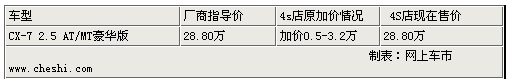 作為一款具有跑車化外觀和馬自達操控DNA的中型SUV,馬自達CX-7自去年11月上市以來一直備受關注。根據網上車市價格監測系統顯示,自CX-7上市以來,各4S店一直持續提現車加價0.5萬-3.2萬元,而近期北京馬自達4S店出現了平價銷售現象,售價為廠商指導價28.8萬,少量現車供應。具體車型價格如下: