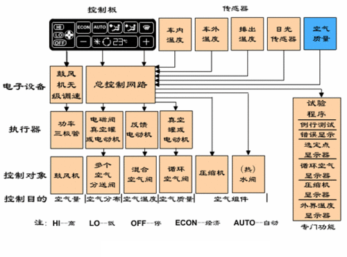 全自動(dòng)溫度控制系統(tǒng)的組成包括溫度傳感器、控制系統(tǒng)ECU、執(zhí)行機(jī)構(gòu)等。其中溫度傳感器有車外氣體溫度傳感器、車內(nèi)氣體溫度傳感器、日照傳感器(陽光強(qiáng)度傳感器)和蒸發(fā)器溫度傳感器。