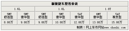 新駿捷各車型售價分別為,1.6舒適型8.88萬、1.6豪華型9.88萬、1.8舒適型9.88萬、1.8豪華型10.88萬、1.8自動豪華型12.88萬、1.8T6MT豪華型13.88萬以及1.8T5AT尊貴型15.88萬。據華晨汽車經銷商處銷售人員介紹已經開始接受客戶預定,展車已經到店,有購買意向的消費者可以到店賞車。