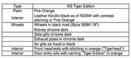 外觀方面,M3 Tiger特別版的進(jìn)氣格柵、反光鏡邊緣都使用了黑色,而車輪部分也升級(jí)為寶馬的359M系列(16輻)運(yùn)動(dòng)化鍛造黑色19英寸輪轂,配合銀色的鍍鉻排氣管。內(nèi)飾部分,M3 Tiger紀(jì)念版的內(nèi)飾為黑色真皮坐椅,對(duì)應(yīng)火焰橙的走線。