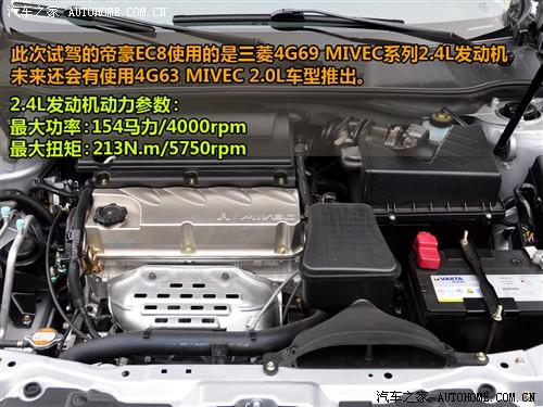此次試駕的帝豪EC8車型全稱為EC825,采用的是三菱2.4L 4G69發(fā)動機(jī),這臺發(fā)動機(jī)可是有歷史念頭了,國內(nèi)很多廠家都在使用這臺發(fā)動機(jī)作為自己的動力單元。而帝豪EC8使用的這臺發(fā)動機(jī)則是原裝進(jìn)口的4G69 MIVEC發(fā)動機(jī),雖然從數(shù)據(jù)上看并么有什么亮點(diǎn),但是發(fā)動機(jī)本身質(zhì)量比較過硬,同時在油耗方面比較控制的相對較好。