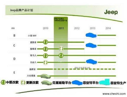 通過Jeep近兩年的產品規劃圖可以看出,Jeep自由人將于2013年開始使用菲亞特生產平臺前,而且在明年還將推出新款自由人。Jeep牧馬人將于明年推出70周年紀念版車型,并且一直持續生產。除Jeep指揮官將于2010年末停產外,Jeep大切諾基將繼續保持克萊斯勒血統一直生產,并且新款大切諾基將于今年年底引入國內。