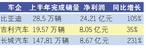 受益于上半年車市的產(chǎn)銷兩旺,三大車企的業(yè)績?nèi)飄紅,其中長城汽車取代比亞迪成為業(yè)績?cè)鲩L最迅速的民營車企,吉利汽車忙于整合沃爾沃轎車業(yè)務(wù),暫時(shí)沒有突出表現(xiàn)。