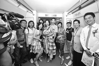 8月28日,北京,一對新人一改平常的婚車車隊接親,以騎自行車,換城鐵、地鐵的方式到達婚禮現場,舉辦了一個綠色、時尚的婚禮。