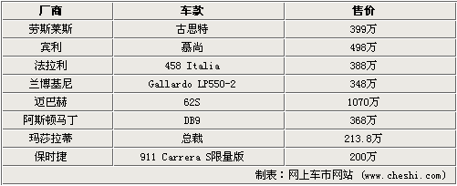 這次成都車展勞斯萊斯、賓利、法拉利、蘭博基尼等高端品牌悉數參展,為成都的消費者帶來了其當家車款,比如古思特、慕尚、458 Italia、Gallardo LP550-2都是上市不久的新車,邁巴赫在車展上首發了其全新一代62S,預計售價1070萬元,而保時捷也發布了911 Carrera S Porsche Carrera Cup Asia,限量發售30臺預售200萬。