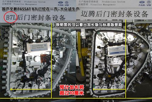 目前,加長版的PASSAT B7已經在一汽-大眾長春的第二工廠進行了試生產,在PASSAT B6(邁騰)的生產線上,我們發現了標有“B7L”字樣的后門密封條設備。與目前在產的標準軸距版邁騰相比,僅后門的長度就增加了10厘米左右,并且我們從工作人員那里也獲得了“B7L”是加長邁騰的肯定答案。由此可見,全新PASSAT B7加長版落戶一汽-大眾已成定局。