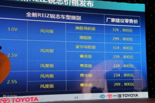 此次國(guó)產(chǎn)新一代豐田銳志推出了2.5L、3.0L兩種排量共計(jì)7款車(chē)型。其中2.5L排量的車(chē)型包括:2.5S風(fēng)度菁華版、2.5S風(fēng)尚菁華版、2.5V風(fēng)度菁英版、2.5V風(fēng)尚菁英版、2.5V風(fēng)尚豪華導(dǎo)航版;3.0L排量的包括:3.0V風(fēng)尚旗艦版、3.0V風(fēng)尚旗艦導(dǎo)航版。