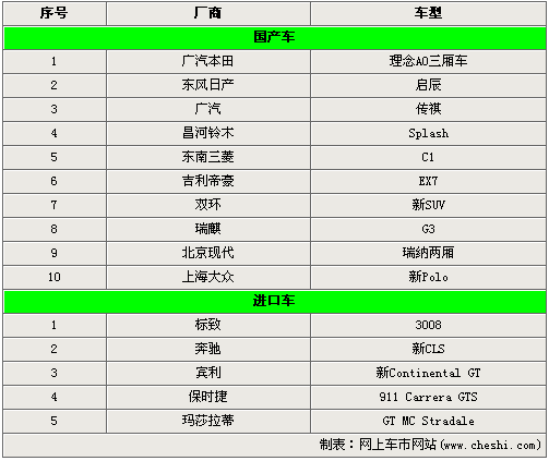 在本屆廣州車展上,預計將有10款國產新車和5款進口新車首發,其中廣汽本田理念A0三廂車、東風日產啟辰、昌河鈴木Splash等新車都是首次亮相,而其他如傳祺、東南C1、瑞麒G3等車型很可能在廣州車展上市。在進口車方面,標致3008、奔馳新CLS等將亮相廣州,另外豪華品牌賓利、保時捷、瑪莎拉蒂等都有新車發布。