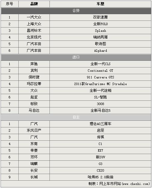 從表中可以看出,在2010年第四季度(10-12月)共有23款新車將于消費者見面。合資品牌品牌共有6款車型登場,上海大眾的全新POLO和廣汽本田的歌詩圖是關注度相對高的兩款明星車型;進口陣營中奔馳全新CLS已經被炒得非;馃,而售價低很多的起亞SL-智跑則會引起共多SUV愛好者的注目;自主幫派以9款新車雄居榜首,第四季度這部分的特點在于有全新的品牌加入戰局,廣汽、東風等合資品牌都將下一步的計劃投身到自主品牌的浪潮之中。