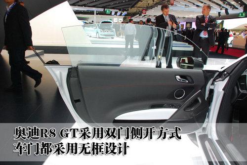 奧迪R8 GT采用雙門側開的方式,雖然不想蘭博基尼剪刀門式那樣拉風,但無框的設計依然在低調中蘊藏著不羈的個性。奧迪R8 GT的車門內側把手也采用輕量化材料打造,而且車門迎賓踏板上還印出了彰顯身份的字樣。