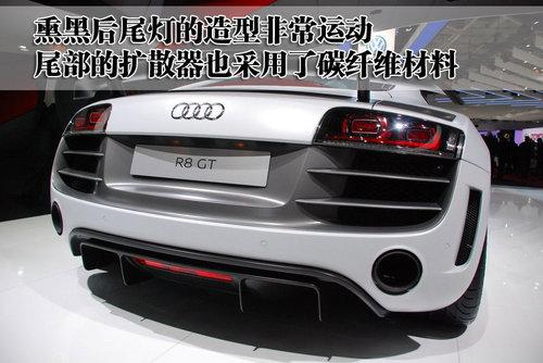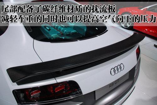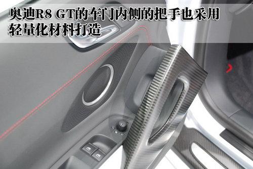奧迪R8 GT的后風擋也采用聚碳酸酯的合成材料打造,有助于車身的重量減輕。而且這款車的尾部配備了碳纖維材質的擾流板,在減輕車重的同時也可以提高空氣向下的壓力,達到高速、穩定的效果。