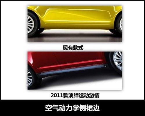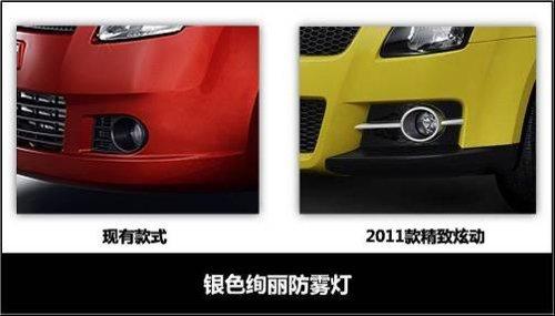 2011款雨燕在外型上與現(xiàn)款車(chē)型相比有了很大突破,甚至能夠稱(chēng)之為運(yùn)動(dòng)款,運(yùn)動(dòng)元素遍布整個(gè)車(chē)身。前大燈、霧燈裝飾、前保險(xiǎn)杠、進(jìn)氣格柵均進(jìn)行了重新設(shè)計(jì)。前臉上巨大的進(jìn)氣口和黑底的前大燈顯得酷勁十足且更具侵略性;霧燈區(qū)域的變化也很搶眼,原本與條紋格柵相一致的黑色霧燈經(jīng)過(guò)銀色裝飾后,視覺(jué)沖擊力更強(qiáng)。車(chē)身側(cè)面增加了空氣動(dòng)力學(xué)側(cè)圍裙邊,動(dòng)感魅力更加明顯。