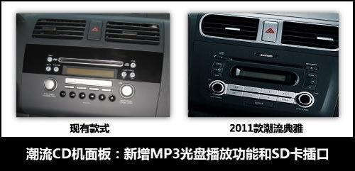 內(nèi)飾方面,銀色成為雨燕2011款內(nèi)飾的主色調(diào)。方向盤(pán)采用點(diǎn)狀皮紋,真皮觸感;經(jīng)過(guò)重新設(shè)計(jì)的CD面板,按鍵布局更加合理,按鈕與銀色按鍵組合協(xié)調(diào)。CD還新增了MP3光盤(pán)播放功能和SD卡插口,可以播放多種格式音樂(lè)。