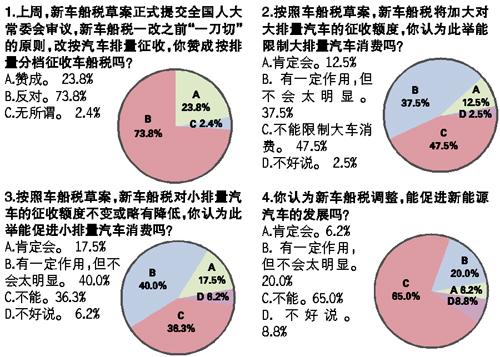 對(duì)于車(chē)船稅的這種調(diào)整方向,廣大消費(fèi)者是如何看待的呢?上周,本報(bào)聯(lián)合新浪汽車(chē)對(duì)此進(jìn)行了調(diào)查,結(jié)果顯示,多數(shù)讀者表示:贊成車(chē)船稅改變“一刀切”的簡(jiǎn)單征稅模式而進(jìn)行這種更趨向公平的改革,但認(rèn)為“不是按價(jià)格而是按排量劃分檔次征收,仍然顯得不太合理”。在調(diào)查中,有73.8%的消費(fèi)者持這個(gè)觀點(diǎn),另外還有2.4%的消費(fèi)者棄權(quán),只有23.8%的消費(fèi)者表示贊成。