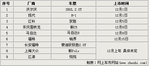 其中,在12月1日就將有兩款新車上市,分別為S80L 2.0T和現(xiàn)代H-1,另外還有江鈴馭勝、新C5、馬自達8等三款新車也確定了具體上市時間,而江淮悅悅、新Polo、GX2等4款車上市時間未定。從上表可以看到,這9款新車涵蓋了小型車、中級車、豪華車、SUV及商務車等不同類型,可以滿足消費者各項用車需求。
