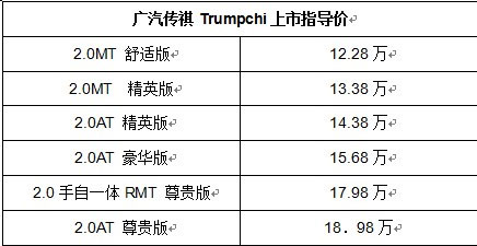 有媒體評論,廣汽傳祺Trumpchi上市發布會無論是地點的選擇、嘉賓的人數還是現場氣勢的營造,都創下了業界的多個第一,堪稱國內有史以來規模最宏大的新車上市儀式。而12.28萬——18.98萬元極具競爭力的定價,輔以完善的“加分服務”,使得廣汽傳祺Trumpchi一上市便成為中高級轎車陣營2.0L級別最具性價比優勢的車型。可以預見的是,依托廣汽集團強大的品牌號召力和品質口碑,廣汽傳祺Trumpchi必將一炮而紅,成為中高級轎車市場的全新標桿。