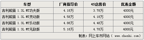 據(jù)吉利4S店銷售人員介紹,吉利熊貓手動(dòng)版的高配車型可滿足消費(fèi)者需要,而低配的車型較少。目前主推4.58萬(wàn)的靈動(dòng)版和4.88萬(wàn)的樂(lè)動(dòng)版兩款車型,手動(dòng)版全系可給出4000元的優(yōu)惠。全新的升級(jí)版熊貓也將在近期分批到店,屆時(shí)升級(jí)不加價(jià)的新車仍可享受店內(nèi)的優(yōu)惠幅度。另外,銷售人員表示,目前店內(nèi)沒(méi)有自動(dòng)版的新車,僅接受預(yù)訂,訂金5000元,新車將在下月中下旬分批到店。