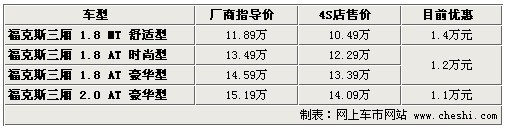據(jù)4S店銷(xiāo)售人員介紹:目前福克斯三廂1.8升三款車(chē)型現(xiàn)車(chē)充足,尤其銀色、灰色、藍(lán)色、黑色車(chē)型現(xiàn)車(chē)較多,手動(dòng)擋車(chē)型目前優(yōu)惠1.4萬(wàn)元,優(yōu)惠后僅售10.49萬(wàn)元,1.8升自動(dòng)版車(chē)型優(yōu)惠1.2萬(wàn)元。2.0升車(chē)型目前現(xiàn)車(chē)較少,顏色也不齊全,訂車(chē)需等待3周左右,目前優(yōu)惠1.1萬(wàn)元。