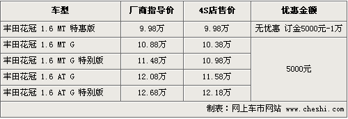 據(jù)4S店銷售人員介紹,花冠特惠版車型在配置方面比現(xiàn)在標(biāo)準(zhǔn)版有所減少,其中包括減少了遙控鑰匙、前進(jìn)氣格柵的鍍鉻裝飾條,揚(yáng)聲器由4個(gè)減少為2個(gè),其他方面并沒(méi)有明顯變化。現(xiàn)在這款車定金為5000元-1萬(wàn)元,最快月底到店,10月份將全面到店。同時(shí)現(xiàn)售的車型價(jià)格方面可以優(yōu)惠5000元現(xiàn)金,但現(xiàn)車數(shù)量不多,仍需要預(yù)訂。