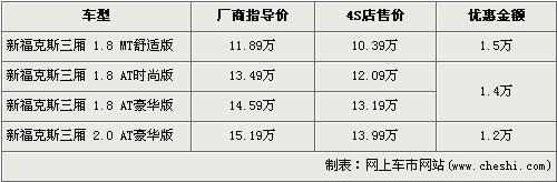 據4S店銷售人員介紹:目前福克斯三廂1.8升三款車型現車充足,尤其銀色、灰色、藍色、黑色車型現車較多,手動擋車型目前優惠1.5萬元,優惠后僅售10.39萬元,1.8升自動版車型優惠1.4萬元。2.0升車型目前現車較少,顏色也不齊全,訂車需等待3周左右,目前優惠1.2萬元。