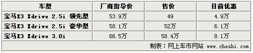 繼X5成功的引進我國后,寶馬又將其X系列旗下的緊湊型SUV寶馬X3帶到了中國。目前國內(nèi)在售的X3 2.5Si與X3 3.0si是在X3基礎上衍生而成的運動版車型,將寶馬特有的靈敏性與運動型多用途車的廣泛實用性完美結(jié)合。近日據(jù)網(wǎng)上車市價格數(shù)據(jù)監(jiān)測顯示,寶馬X3全系最高有近8.1萬元的現(xiàn)金優(yōu)惠,具體詳情請看下表: