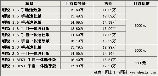 據4S店銷售人員介紹:目前明銳全系最高優惠8500元,部分車型有現車,顏色包括銀色、灰色車型。如需預定需等待1個月至3個月時間。目前1.6升車型優惠達6000元,2.0升車型優惠仍為8000元,1.8TSI的兩款車型優惠8500元,較之前有所縮水。如在店內做裝飾還可打8折,雖然折后裝飾價格仍有些偏高,但產品質量可以保證。
