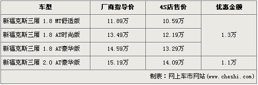 ?怂箲{借出色的外觀設計及極佳的操控性贏得了市場的認可,在銷量方面一直保持迅猛的勢頭。尤其新款福克斯的上市,一改內飾略顯粗糙的詬病,使得福克斯更趨于完美。福克斯采用了沃爾沃S40底盤,將操控進行到底,這一優勢博得全世界的掌聲,名副其實成為了這個級別的標桿車型。據網上車市價格系統檢測顯示,目前三廂?怂谷底罡邇灮1.3萬元,具體車型價格請看下表: